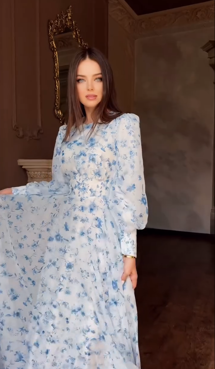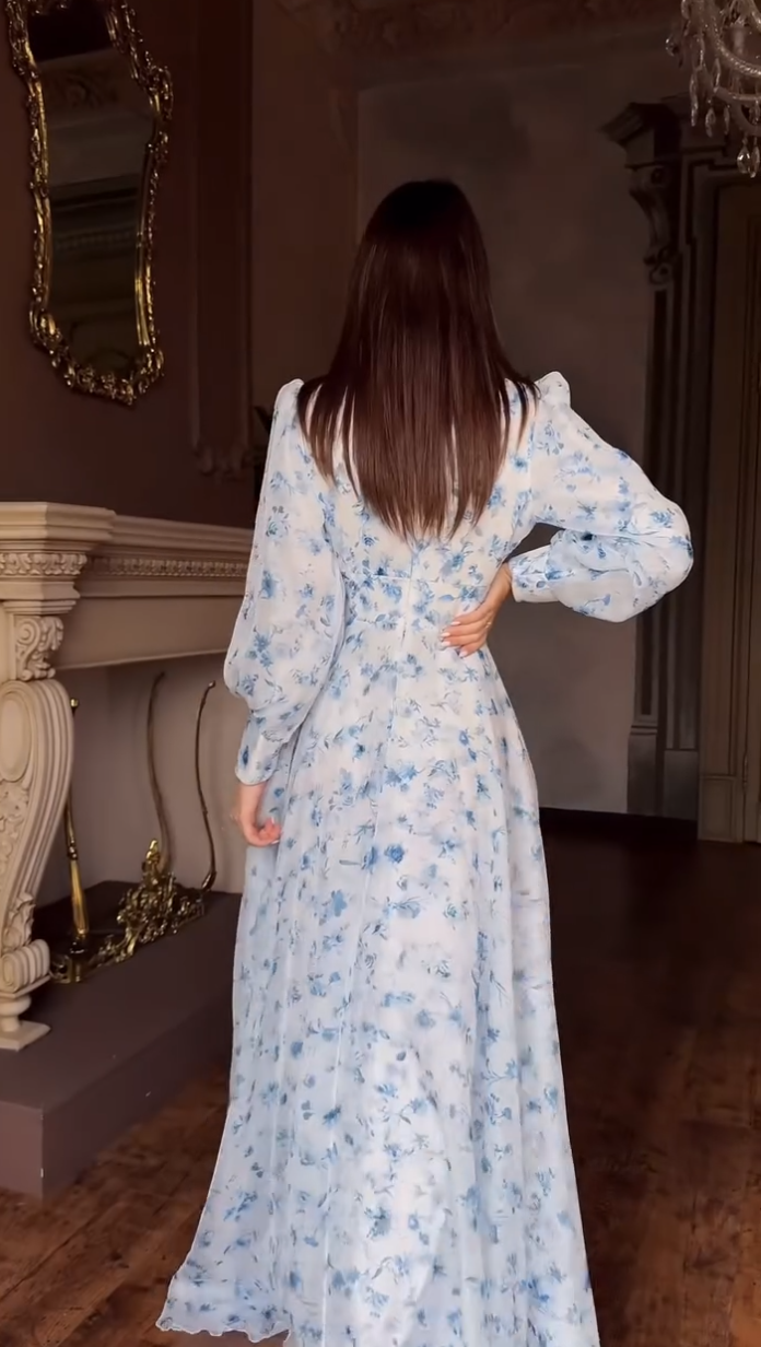 Radiate grace and freshness in the Blue Serenity Floral Printed Dress. Crafted from soft chiffon, this maxi features delicate blue floral prints on a white base, creating a serene and romantic look. The puffed long sleeves and cinched waist add a touch of vintage elegance, while the flowy silhouette ensures effortless comfort and movement. Perfect for daytime gatherings, garden events, or semi-formal occasions where subtle charm stands out beautifully.