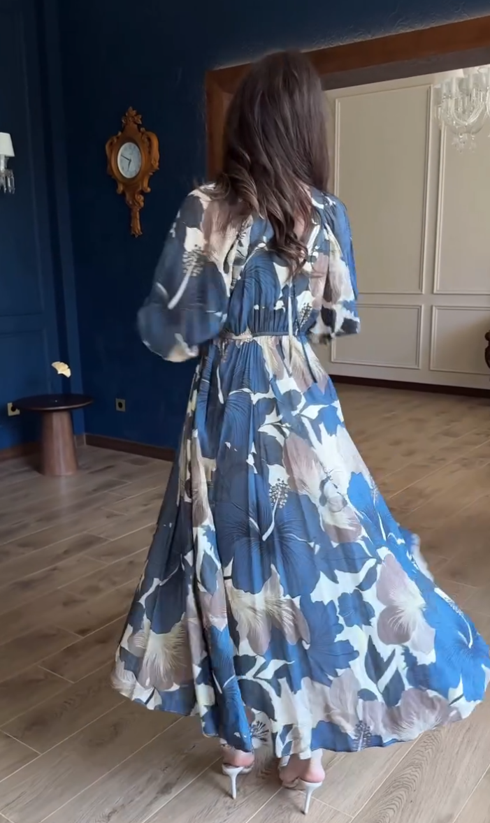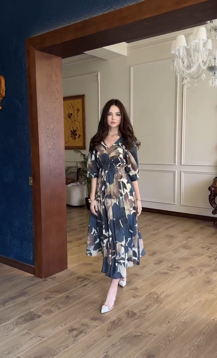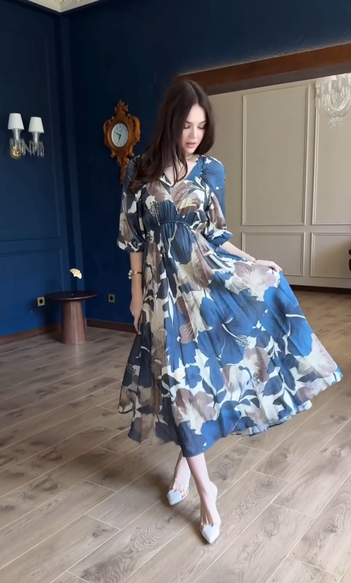 Step into serene sophistication with the Bluewood Flora Printed Dress — a flowing maxi that beautifully blends art and elegance. Adorned with an abstract floral print in rich shades of deep blue, brown, and cream, this dress captures the essence of natural grace. The V-neckline and cinched waist flatter the silhouette, while the soft puff sleeves add a touch of romantic charm. Perfect for evening gatherings, garden affairs, or daytime occasions where effortless beauty speaks louder than words.