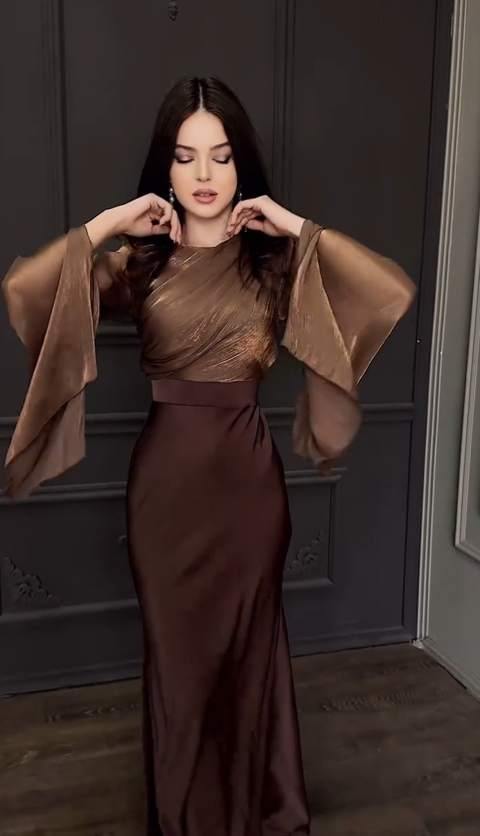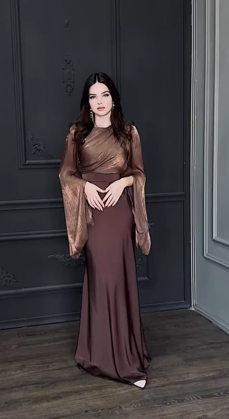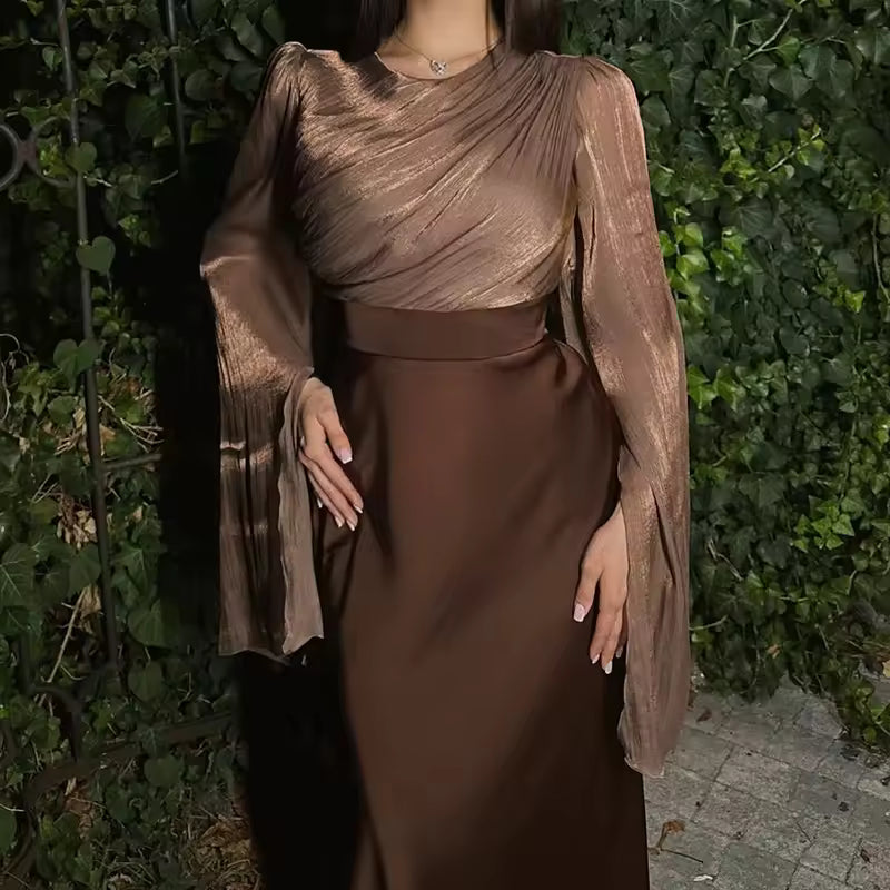 Step into effortless elegance with Brown Chic Trumpet — a sophisticated dress that radiates warmth and charm. This formal dress features a subtle brown sheen complemented by graceful trumpet sleeves, creating a refined silhouette that embodies timeless style. Crafted from soft, high-quality fabric, Brown Chic Trumpet moves gracefully with every step, making it the perfect choice for evening soirées, formal gatherings, or elegant daytime affairs.