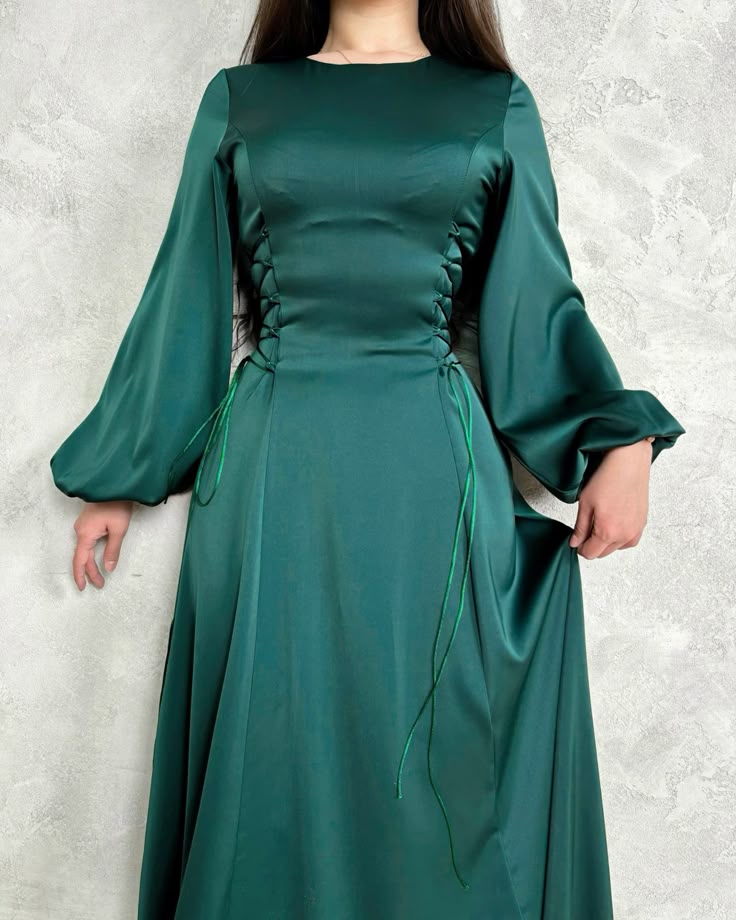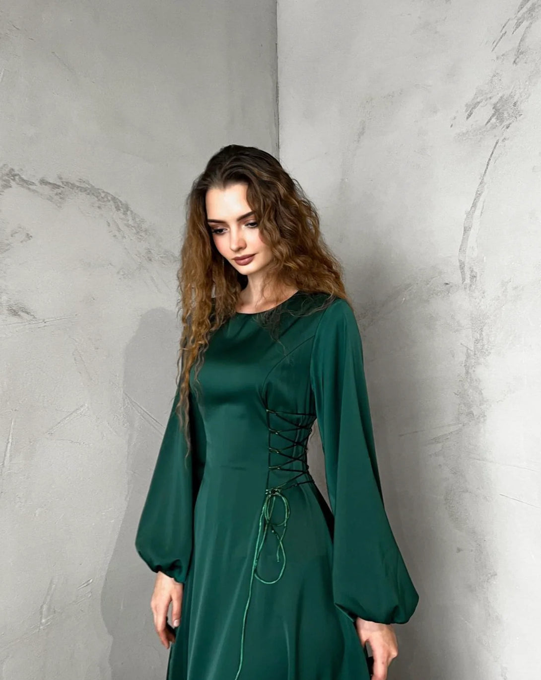 Captivate with timeless elegance in the Green Glimmer Muse, a stunning dress that blends luxurious satin silk with an enchanting dark green hue. The smooth, figure-hugging silhouette effortlessly accentuates the waist, while the satin fabric glimmers with every movement, creating a captivating aura. Perfect for an evening of sophistication, this dress is an exquisite choice for formal events, gala dinners, or any occasion where allure meets refinement.