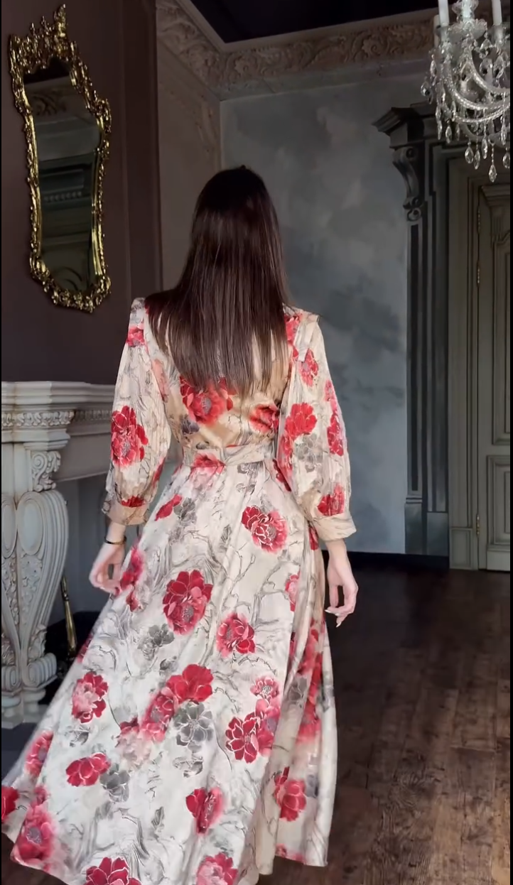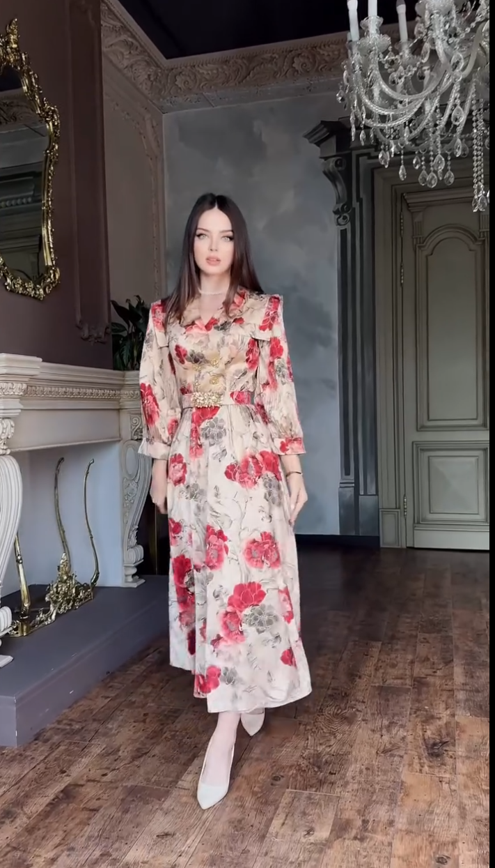 Exude timeless grace with the Regal Rose Blossom Pleated Print. Crafted from luxurious chiffon, it features a vintage-inspired floral design in rich shades of red and gold on a soft beige base. The structured bodice with golden buttons and an ornate waist embellishment adds a royal touch, while the pleated sleeves and flowing silhouette bring effortless elegance. Perfect for festive gatherings, evening soirées, or formal occasions.
