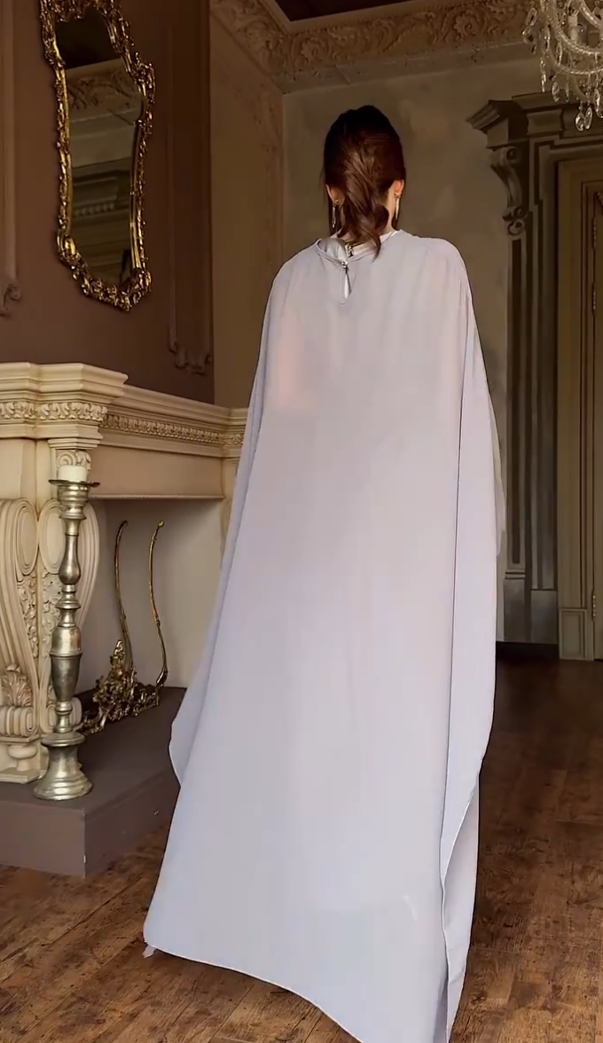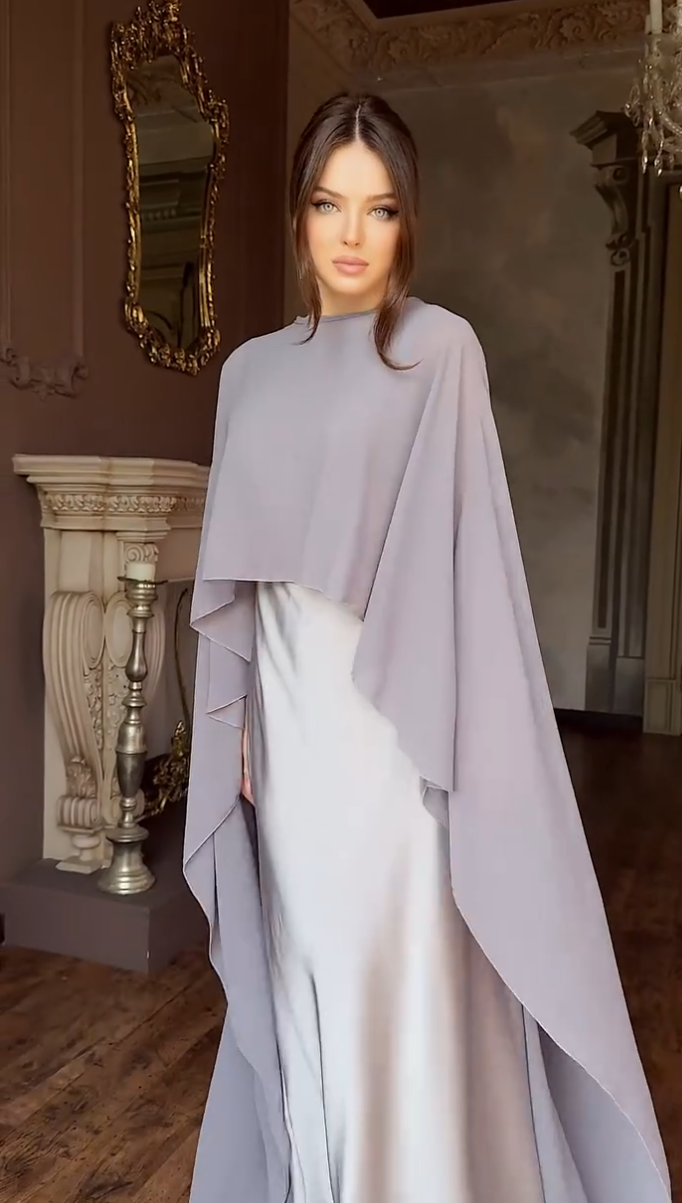 Step into refined sophistication with Silver Glow Veil, a stunning silver silk bodycon gown paired with a flowing grey chiffon veil that radiates grace, poise, and modern glamour. The premium silk bodycon hugs the silhouette with a sleek, flattering fit, while the soft grey chiffon veil cascades effortlessly, adding a dreamy, airy layer of sophistication. The shimmering silver hue evokes radiance, luxury, and understated elegance, making this ensemble perfect for evening soirées, weddings, or any occasion where you wish to leave a lasting impression.